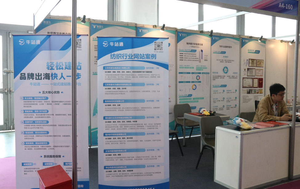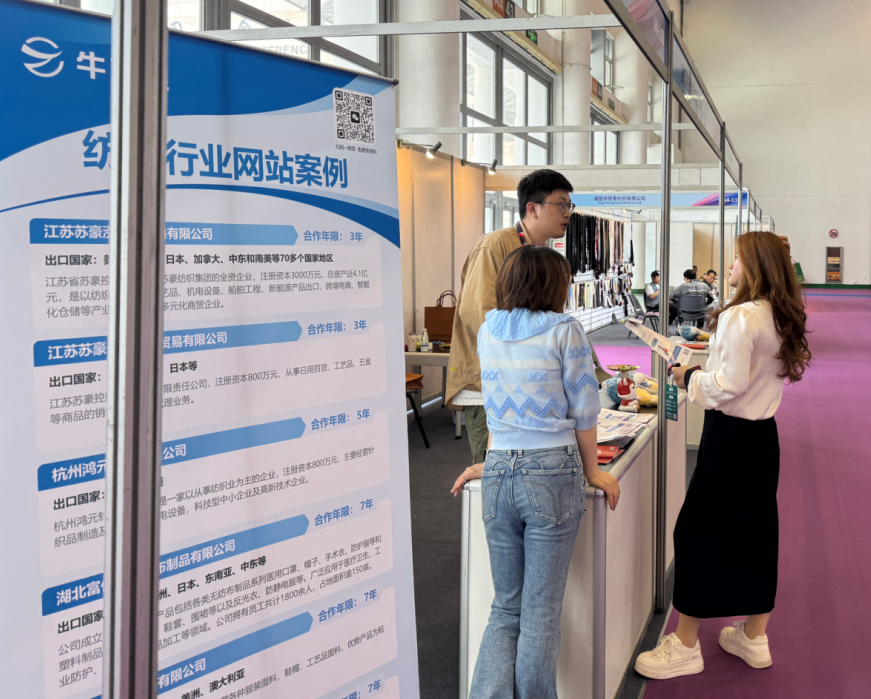 展会现场,外贸牛展位前人头攒动。针对纺织品企业出海面临的品牌定位模糊、营销渠道单一、本地化运营不足等痛点,外贸牛团队带来了“品牌诊断-全球布局-精准营销-数据运营”的全流程解决方案。通过整合可视化建站、全球搜索引擎、社交媒体、GEO等多渠道资源,帮助企业打造符合海外市场需求的品牌形象,实现从“产品出海”到“品牌出海”的升级。